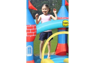 Dmuchany zamek Happy Hop z podwójną zjeżdżalnią to doskonały wybór dla dzieci uwielbiających aktywną zabawę. Klasyczny dmuchaniec został udoskonalony – wejście do zamku zostało zmodyfikowane, a zjeżdżalnia poszerzona, dzięki czemu jednocześnie mogą z niej korzystać dwie osoby. Te ulepszenia gwarantują jeszcze większy komfort i radość z zabawy.
